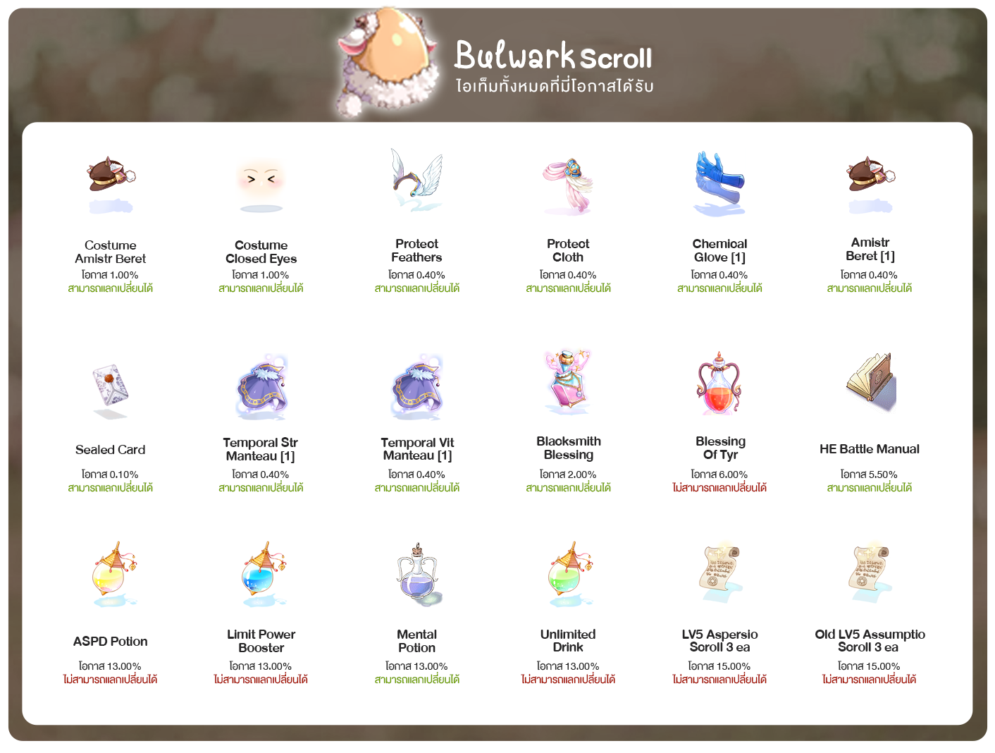 เปิดตัวไข่ Bulwark Scroll สุดยอดแรร์ไอเทม มาให้เพื่อนๆ ทุกคนได้ทำการสุ่มลุ้นรับคอสตูมอย่าง Costume Amistr Beret และ Costume Closed Eyes พร้อมให้เพื่อนๆได้สุ่มหา