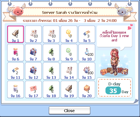 ก็รับไอเทมกันไปได้ง่ายๆเลย พิเศษสุดเมื่อทำการ Login ครบ 20 วัน ก็จะได้รับ ไอเทมช่วยเหลือประจำเดือนกุมภาพันธ์ เช่น ไอเทมเพิ่มค่าสถานะต่างๆ และไอเทมสุดพิเศษ