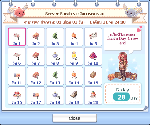 เมื่อเพื่อนๆ ทำการเข้าเกม ครั้งแรกของวันก็รับไอเทมกันไปได้ง่ายๆเลย พิเศษสุดเมื่อทำการ Login ครบ 20 วัน ก็จะได้รับ ไอเทมสุดพิเศษ