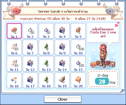 ผู้เล่นสามารถเข้าร่วมกิจกรรมได้ทุกวัน เพียงแค่ผู้เล่น Login และกดรับไอเทมจากหน้ากิจกรรมได้วันละ 1 ครั้ง และของรางวัลจะถูกเข้า RodEx ของผู้เล่นทันที
