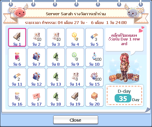 ผู้เล่นสามารถเข้าร่วมกิจกรรมได้ทุกวัน เพียงแค่ผู้เล่น Login และกดรับไอเทมจากหน้ากิจกรรมได้วันละ 1 ครั้ง และของรางวัลจะถูกเข้า RodEx ของผู้เล่นทันที